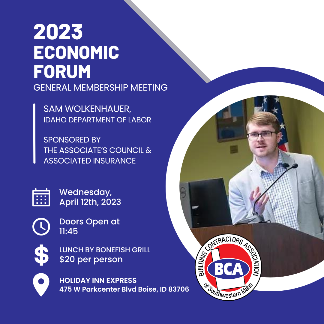 Please join us for a BCASWI annual General Membership meeting about the state of the economy. Our Special Guest speaker this year will be Samuel Wolkenhauer, Labor Economist for the Idaho Department of Labor. Sam’s well rounded economic knowledge and his great sense of humor promises to make for a great meeting during this time of economic unrest and continued labor shortages.