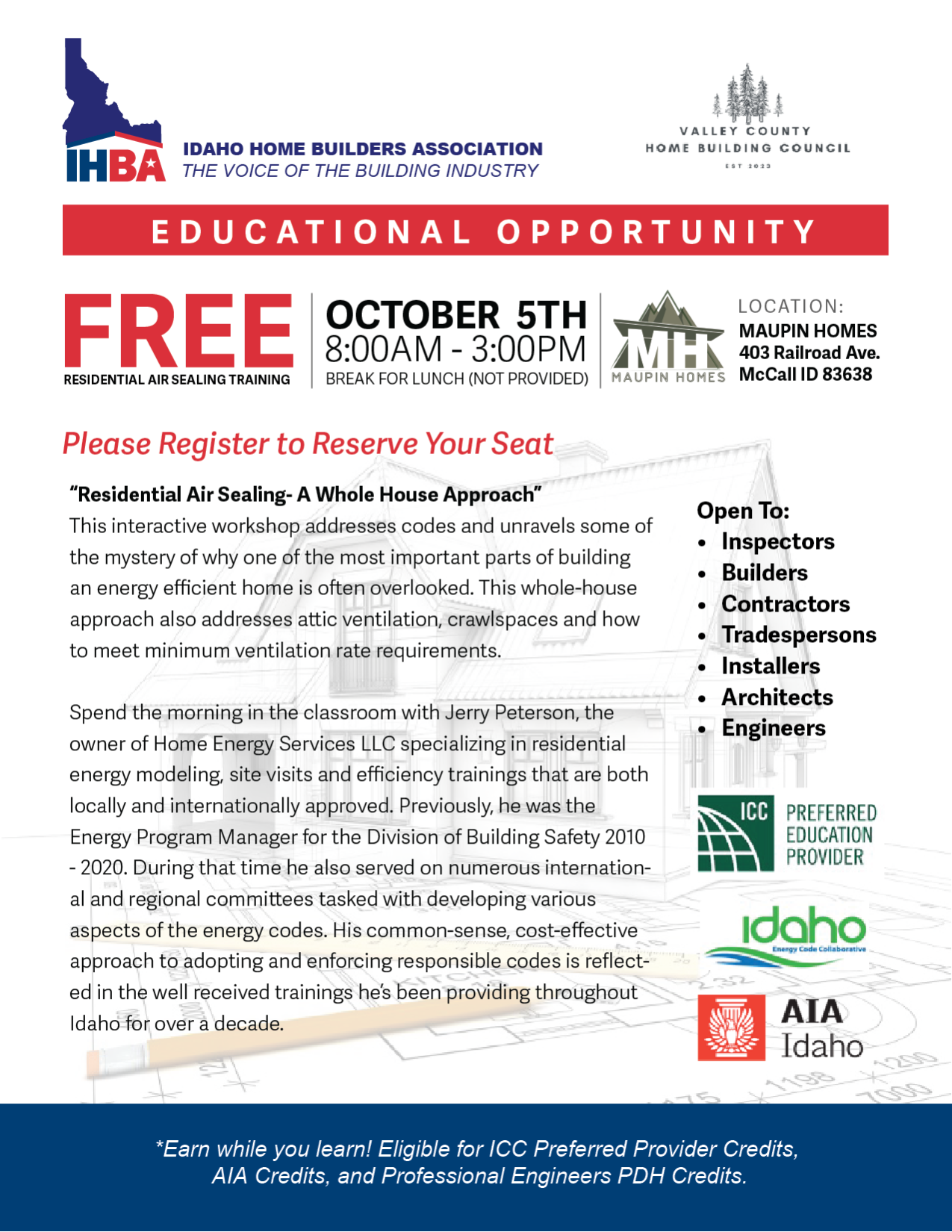 We are excited to offer our membership a FREE Residential Air Sealing Training Course. This educational opportunity was made possible through grants written by IHBA.