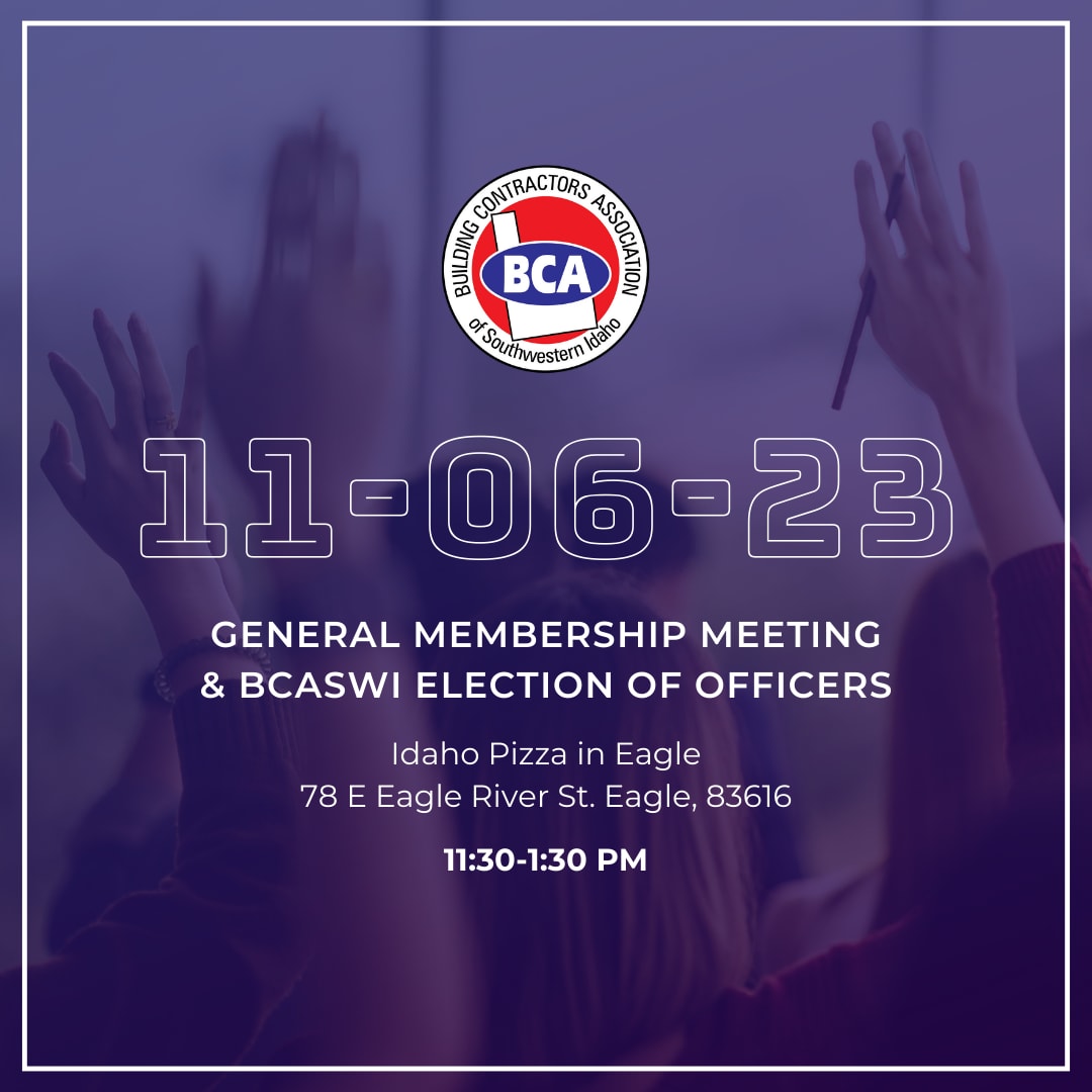 Please join us for our BCASWI General Membership Meeting and Annual Election of Officers. Your attendance is important as we are voting for our new 2024 BCASWI Board. Also on the Agenda... Dave Yorgason and Ken Burgess will give a Government Advocacy update as well as recommendations for the November 7th Election and Scott McDaniel & Kim Pennington, with Blue Cross of Idaho will be there to speak and answer questions about our new health care plan.