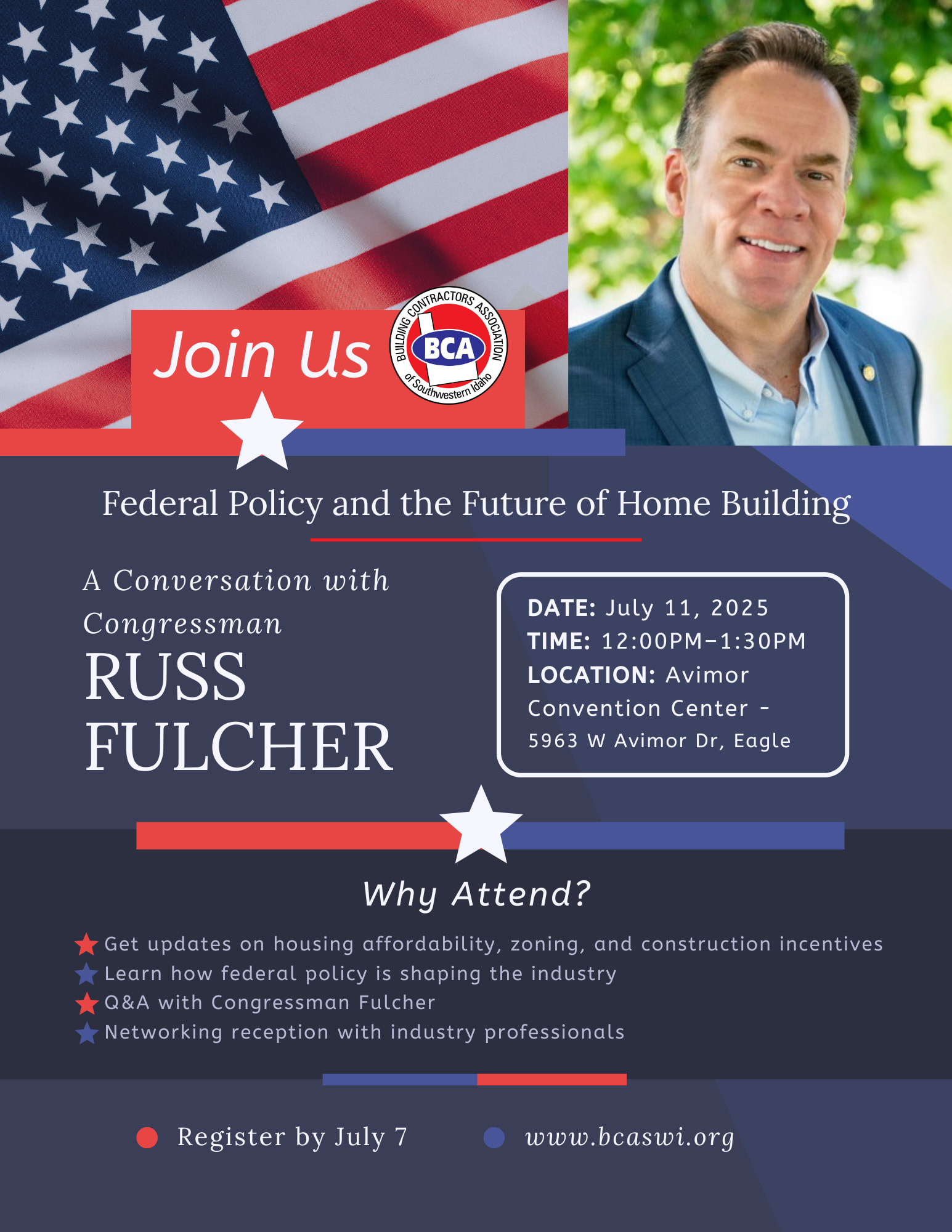 Federal Policy and the Future of Home Building • Get updates on housing affordability, zoning, and construction incentives • Learn how federal policy is shaping the industry • Q&A with Congressman Fulcher • Networking reception with industry professionals