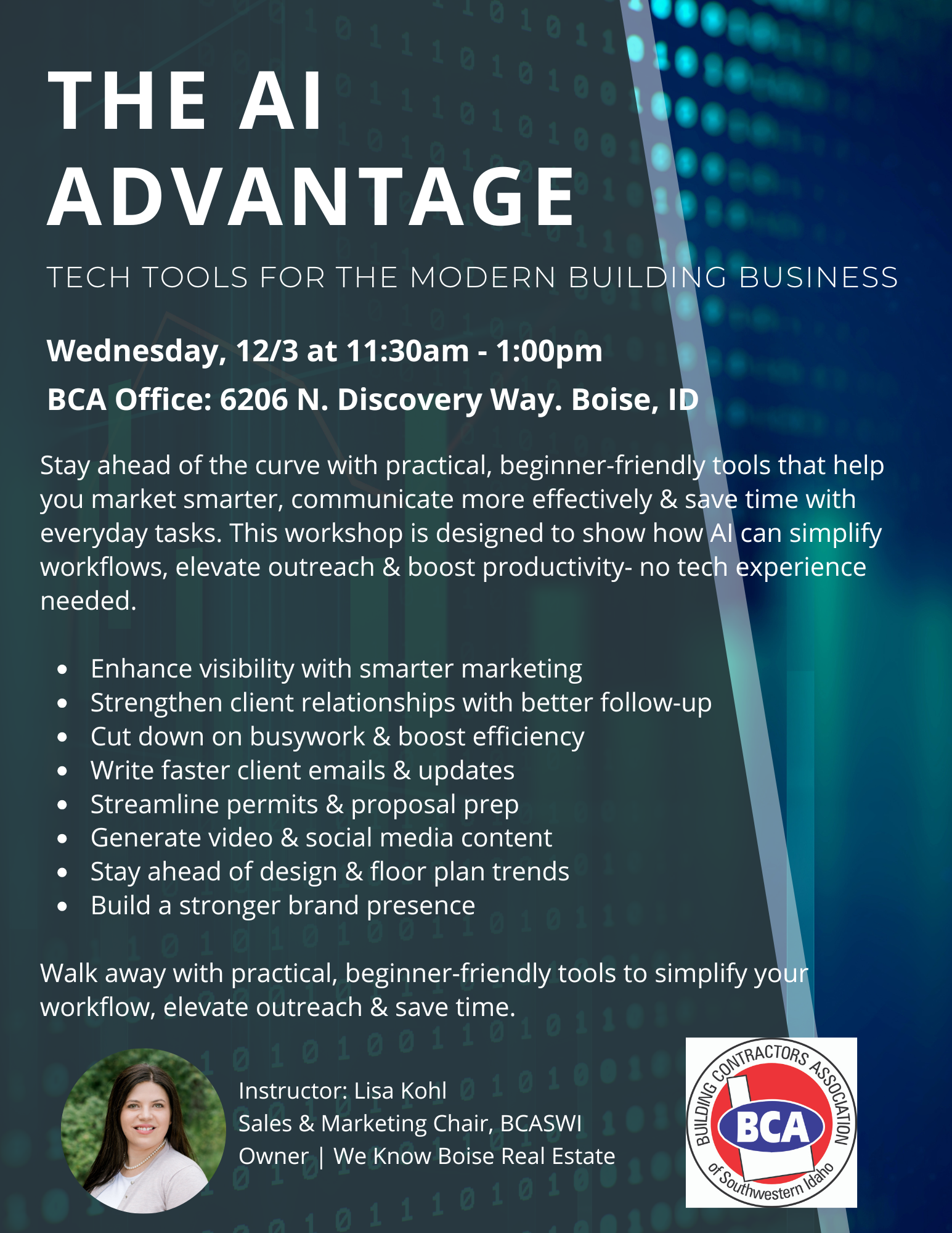 Stay ahead of the curve with The AI Advantage, a hands-on workshop designed to introduce builders, contractors, and business professionals to practical, beginner-friendly AI tools that make everyday work faster, smarter, and more efficient.